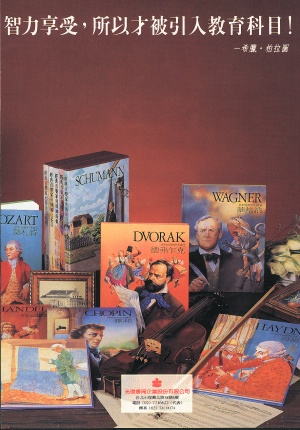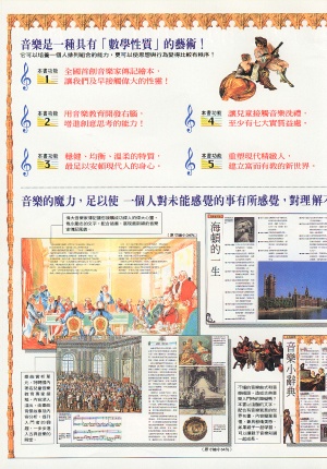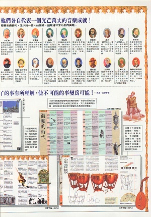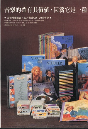 ![]() | 二十位偉大的音樂家: 韋瓦第、巴赫、韓德爾、海頓、莫札特、貝多芬、舒伯特、蕭邦、舒曼、華格納、威爾第、約翰‧史特勞斯、布拉姆斯、柴科夫斯基、德弗乍克、馬勒、德布西、拉威爾、巴爾托克、斯特拉溫斯基。